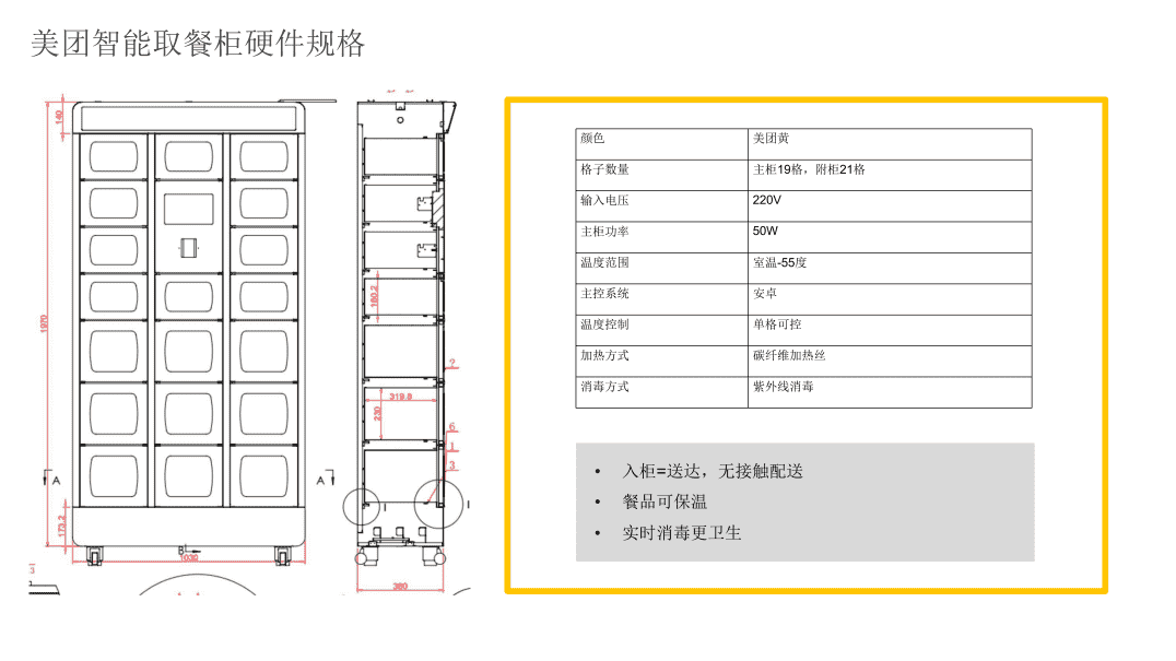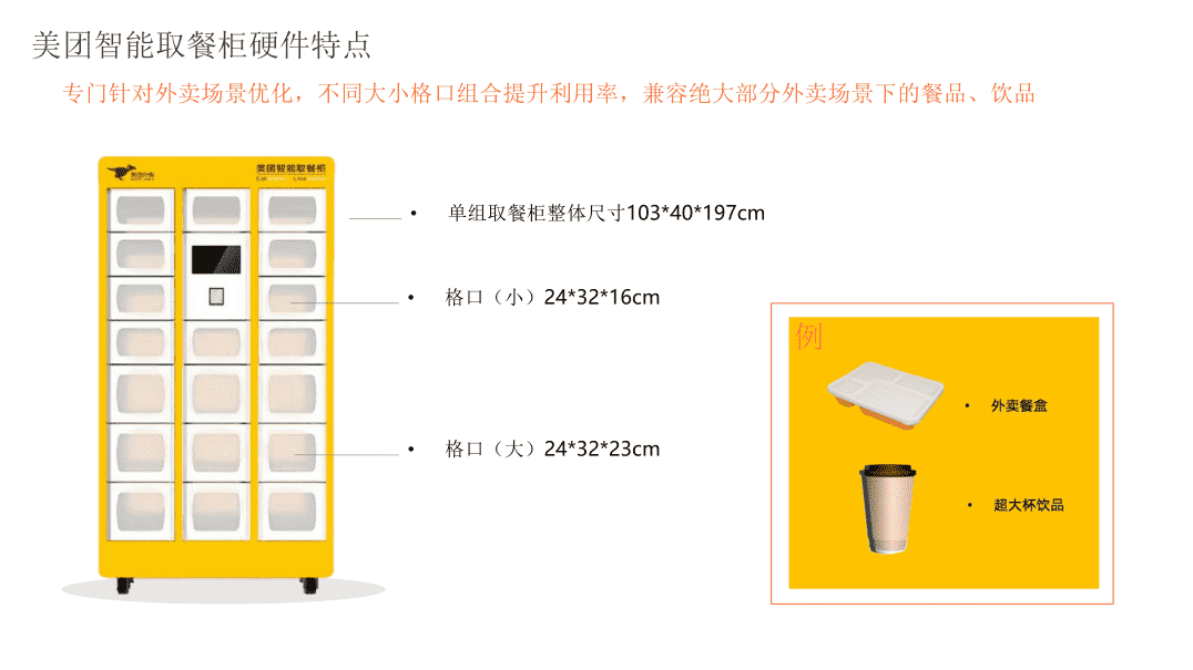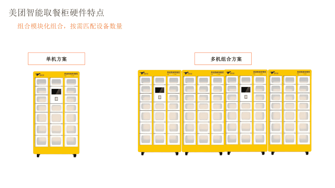 智能外賣柜業(yè)務(wù)是美團(tuán)針對(duì)大型寫字樓、辦公區(qū)等特殊場(chǎng)景推出的全新餐品配送一站式解決方案。是一種可提高騎手交付效率,增強(qiáng)無(wú)接觸配送安全性、減少物業(yè)管理負(fù)擔(dān)的新配送交付模式。