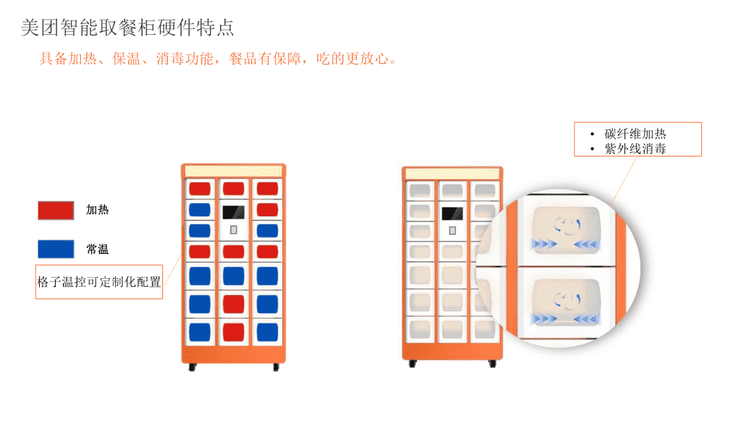 另外,智能外賣柜還能對(duì)餐品進(jìn)行加熱、保溫。讓用戶隨時(shí)都能吃到熱騰騰的飯菜。